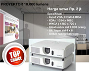 ![]() | Sewa Proyektor Infocus 10,000 lumens | Stacking / Tumpuk, Maksimal untuk layar 4 x 6 mtr. Perlengkapan : Tas Proyektor, Kabel HDMI/VGA Max.10 mtr, Kabel Power | Rp 2.000.000 ( *Call for more Info & Discount ) |