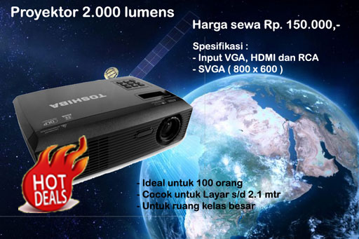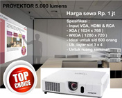 ![]() | Sewa LCD Proyektor 5,000 lumens | Baik untuk layar 2 x 3 mtr dan maksimal untuk layar 4 x 6 mtr. Perlengkapan : Tas Proyektor, Kabel HDMI/VGA Max.10 mtr, Kabel Power | Rp 800.000 ( *Call for more Info & Discount ) |