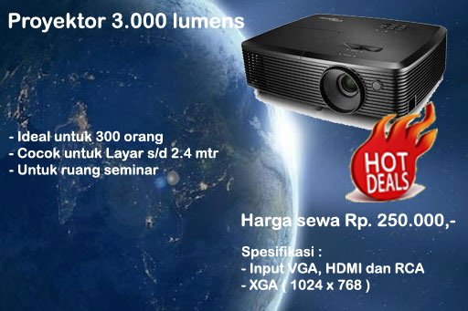 ![]() | Sewa Proyektor 5,800 lumens | Baik untuk layar 2 x 3 mtr dan maksimal untuk layar 4 x 6 mtr. Perlengkapan : Tas Proyektor, Kabel HDMI/VGA Max.10 mtr, Kabel Power | Rp 1.100.000 ( *Call for more Info & Discount ) |